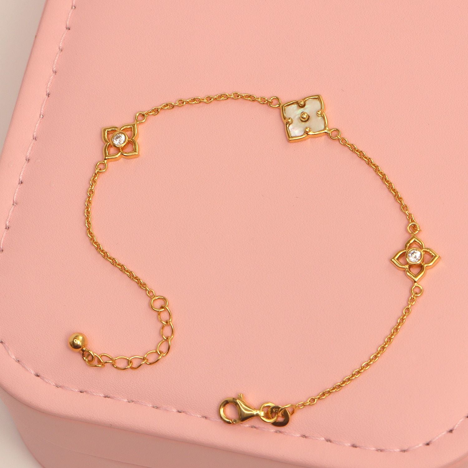 925 Sterling Silver 14K Gold Plated Cubic Zirconia Mother of Pearl Adjustable Malachite Flower Bracelet for Women Teen